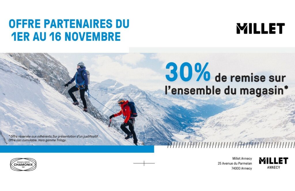 Publié le 21 octobre 2025 par admin Sur présentation de votre licence FFRandonnée, 30% de remise sur l’ensemble du magasin MILLET Annecy, du 1er au 16 novembre 2025