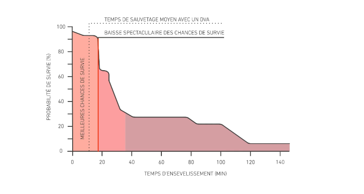 En effet la probabilité de survie d’une personne ensevelie sous une avalanche est de 90% si elle est retrouvée et sortie en moins de 18 minutes. Au delà de ce temps les chances de survie s’effondrent. Sachant qu’en moyenne les secours (alertés immédiatement par le 112, numéro européen) mettront 30 à 35 minutes pour arriver, le secours par les personnes sur place au moment de l’avalanche est prioritaire ! D’où l’intérêt d’avoir avec soi l’équipement complet : DVA + sonde + pelle.